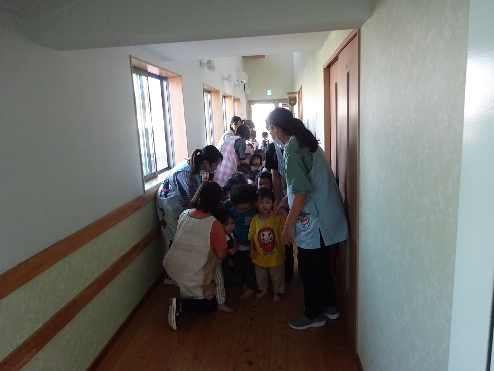 ホールで、だんご虫のポーズになり、各クラス外に避難しました。